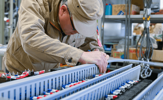 ミズトのしごとWORK 1設計 保有技術 高圧受配電盤(キュービクル)、筐体BOX、架台等の設計・検討 2D-CAD、3D-CAD、電気CADを使用したデータ授受 担当者より お客様の要望や仕様を具体化に向けて設計・検討します。製作仕様を理解し、打ち合わせを重ね、自社の保有技術、設備、原価を考慮して進めています。 2D,3D-CADや電気CADのデータ授受にも柔軟に対応しております。 頭の中で描いた製品が、徐々に工場で形になっていく。個々のプロセスが次へのヒントに繋がります。 2NCプログラム(※ミズト製作所に委託) 保有技術 3D-CAD/CAMを使用した板金、鋼材加工全般の検討・提案 レーザータレパン複合機・プレスブレーキによる加工提案 担当者より 機械を正確に作動させるためのプログラムです。 これを用いて板金の折り曲げや溶接箇所の決定、打ち抜き加工、レーザー切断加工を行います。より効率の良い製品づくりのための重要な工程のため、日々技術向上に取り組んでいます。 3製缶(※ミズト製作所に委託) 保有技術 大形筐体の製缶、架台の製作、導体の加工 ロボット溶接機による均一な仕上がり(量産対応) 各種溶接に対応(アルゴン溶接、TIG溶接、CO2半自動溶接、スポット溶接) 各種鋼材に対応(SPHC、SEHC、SGHC、SUS、アルミなど) 担当者より 板金加工図、展開データシートを用いて、鋼材の加工を行います。 レーザータレパン複合機による自動切断。複雑な曲げ工程を経て溶接加工を行います。 安定した生産力と高い品質(仕上がり寸法や溶接強度)を追求すると同時に、サビ防止を考慮した面取りなど、最終的な「見た目の美しさ」も意識しています。 4塗装(※ミズト製作所に委託) 保有技術 各種塗装に対応 (自然乾燥、メラミン樹脂焼付塗装、ウレタン樹脂塗装、粉体電着塗装など) バッチ式乾燥炉の有効サイズ:W3000×D3500×H3000 吊掛け式乾燥炉の有効サイズ:W1600×H2500の扉等×11枚一括乾燥 担当者より 「塗装面の仕上り」、「ゴミ付着」、「膜厚」、「艶の具合」… どれも深い知識や経験が無くても発見可能な内容ばかりです。 ところが達成するための準備や技術は奥深く、技術の世界が広がります。 現在の塗装は、本来の目的である「防錆」が最低条件になっており、「いかに製品を美しく見せるか」が要求される作業となっています。 5組立 保有技術 高圧受配電盤の組立配線、制御盤の配線、筐体BOXの組立 各種端末処理に対応(圧着、ラッピング、ハンダ) 各種電線に対応(KIP、KIV、導体など) 担当者より 前工程から部材を受取り、製品を完成させる工程です。 様々な機器を取り扱うため、破損や誤実装に注意することはもちろんですが、怪我や事故の無い様にすることを心掛けています。 電気的知識や製品の運用に関する理解を深めると、図面に無い部分まで「あるべき姿」が見えてきます。 6検査 保有技術 高圧受配電盤の電気検査(耐圧、絶縁抵抗、高圧印加、リレー動作試験) 外観検査、膜厚検査、構造検査、配線チェック 各種機器の校正管理 担当者より 「外径寸法」「塗装膜厚」「誤配線」「絶縁性能」「リレー動作」「シーケンス」… どれもが顧客要求を満たすレベルに到達しているか。 実際に高電圧を印加して製品を動作させ、総合的に合否を判断しています。 検査は、製品をお客様にお渡しする最終工程です。この「最後の砦」に誇りを持って検査しています。 ミズトの実績PRODUCT 配電線地中化機材 製品詳細 金属閉鎖形スイッチギヤ 製品詳細 電圧調整設備 製品詳細 通信設備収納架 製品詳細 ミズトのことABOUT US 概要 沿革 企業理念 工場設備 採用情報RECRUIT ミズトではともに働く仲間を募集しています。詳しくは採用ページをご覧ください。 VIEW MORE 主要取引先BUSINESS CONNECTIONS 中国電機製造株式会社 株式会社前川製作所 ホーコス株式会社 中国計器工業株式会社 パナソニック電工電路株式会社 椿本チェイン株式会社 東洋電装株式会社